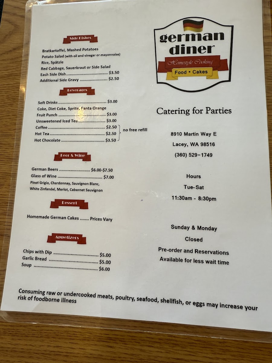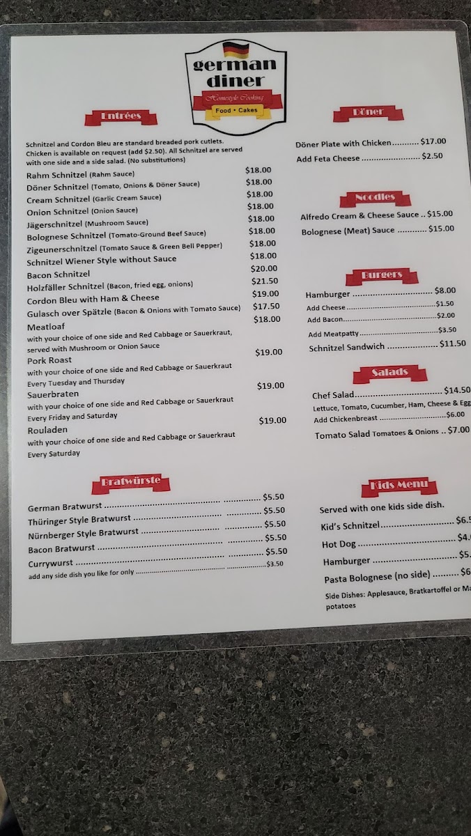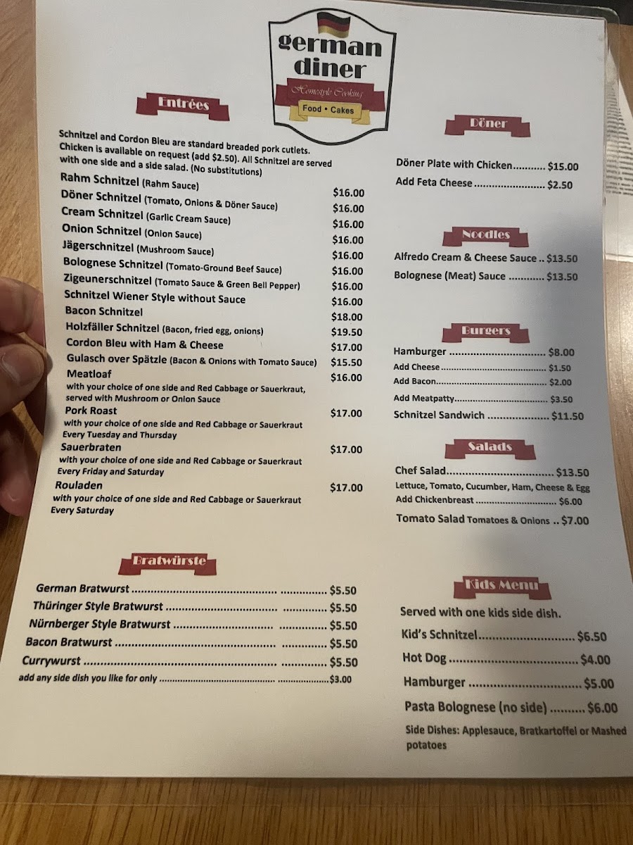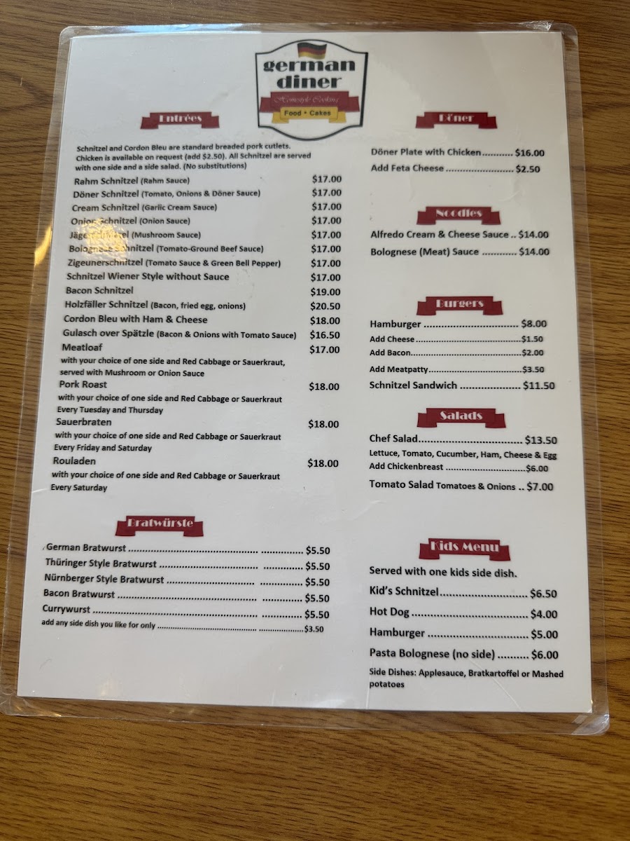 Cordon bleu with ham & cheese. Sides: Bratkartoffel, mashed potatoes, spaetzle, or other potato-based sides. Dressings: Honey mustard, Italian, house, ranch, blue cheese, or thousand island.