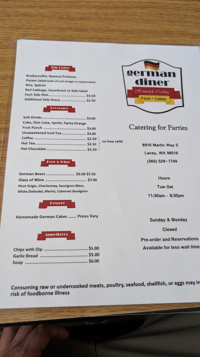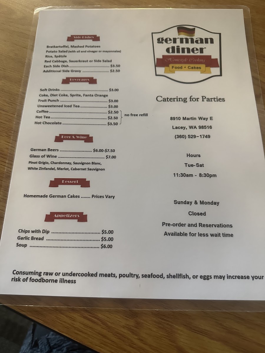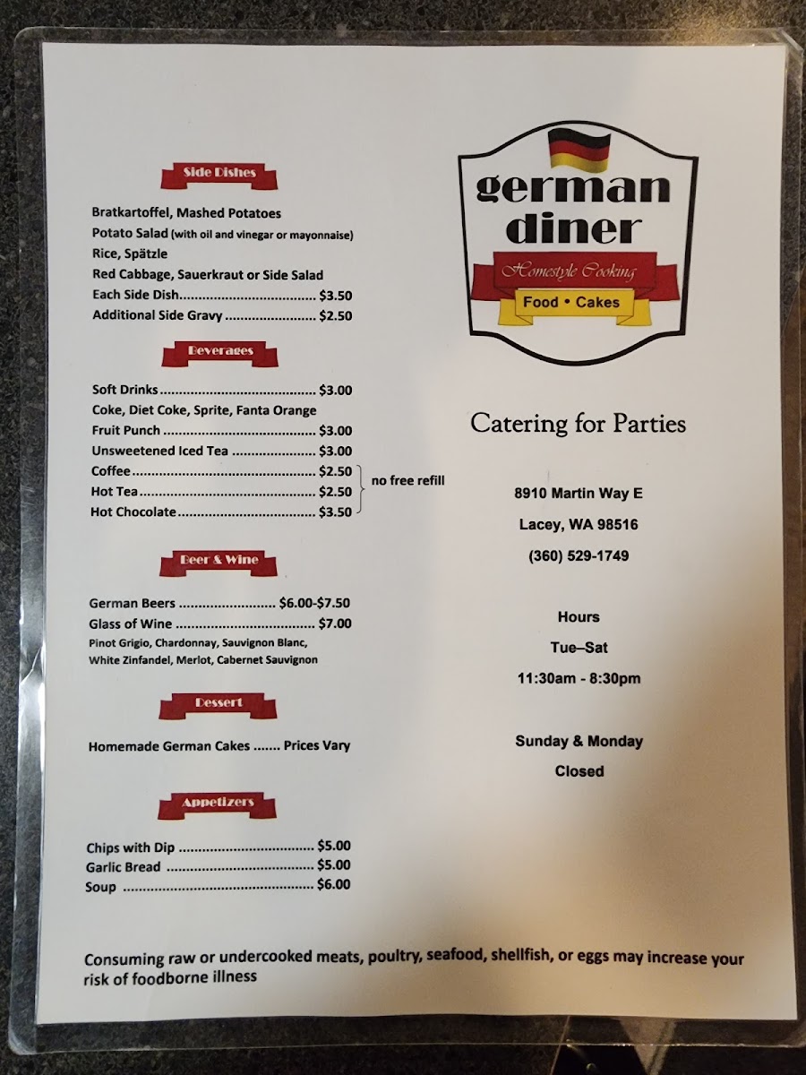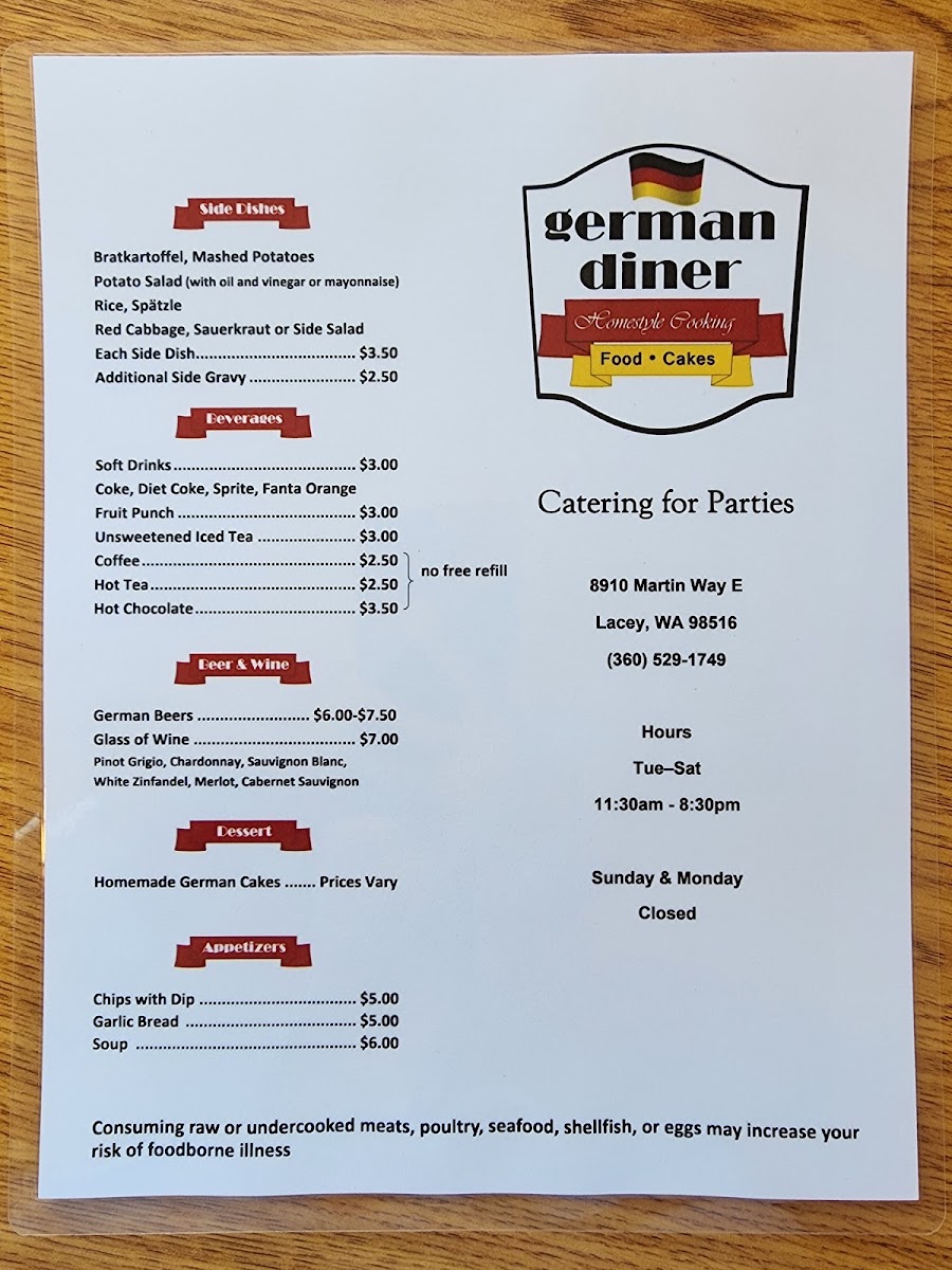 Cordon bleu with ham & cheese. Sides: Bratkartoffel, mashed potatoes, spaetzle, or other potato-based sides. Dressings: Honey mustard, Italian, house, ranch, blue cheese, or thousand island.